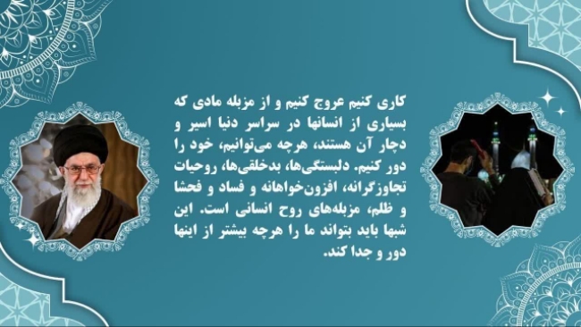 💫 کاری کنیم عروج کنیم و از مزبله مادی که بسیاری از انسانها در سراسر دنیا اسیر و دچار آن هستند، هرچه میتوانیم، خود را دور کنیم. دلبستگیها، بدخلقیها، روحیات تجاوزگرانه، افزونخواهانه و فساد و فحشا و ظلم، مزبلههای روح انسانی است. این شبها باید بتواند ما را هرچه بیشتر از اینها دور و جدا کند.